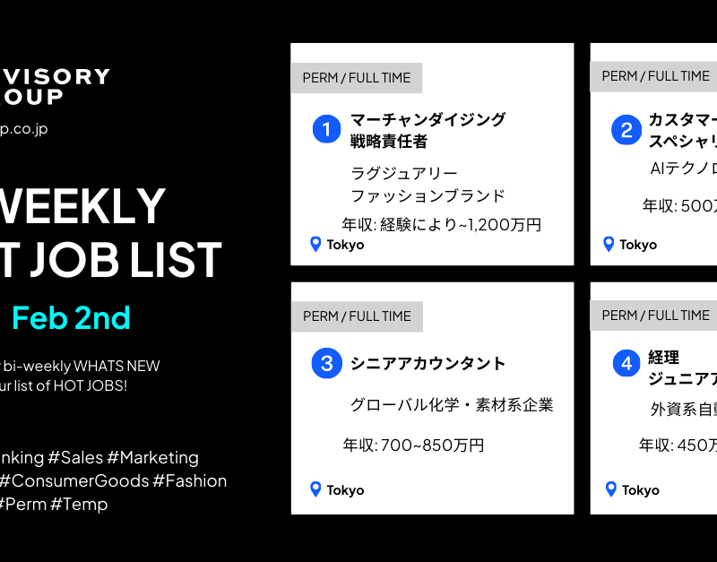 今週の注目求人情報(12月1日〜12月5日) WEEKLY HOT JOB LIST | Dec 1st–Dec 5th Hot Jobs注目求人情報 今週の注目求人情報(12月1日〜12月5日) WEEKLY HOT JOB LIST | Dec 1st–Dec 5th