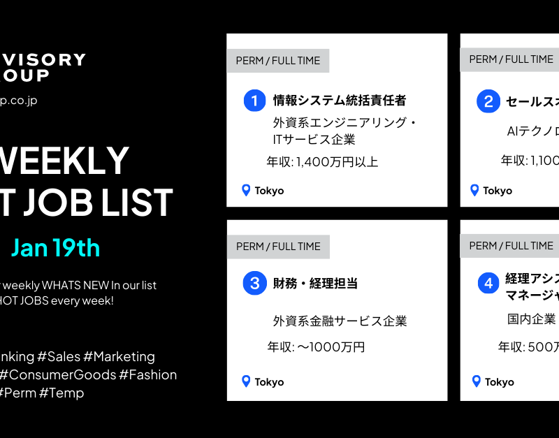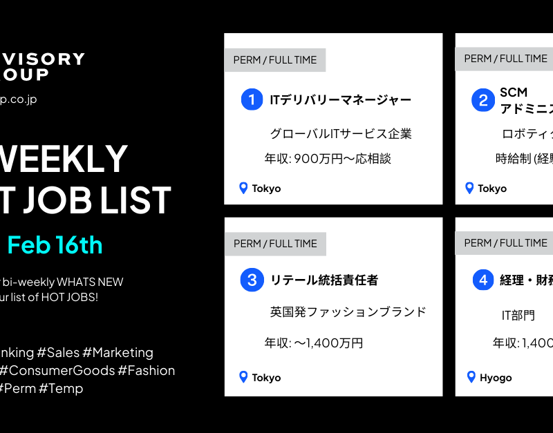 今週の注目求人情報(12月8日〜12月12日) WEEKLY HOT JOB LIST | Dec 8th–Dec 12th Hot Jobs注目求人情報 今週の注目求人情報(12月8日〜12月12日) WEEKLY HOT JOB LIST | Dec 8th–Dec 12th